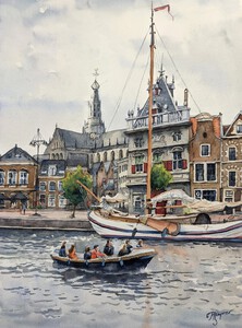 2021Het is levendig op het water in hartje Haarlem. Een prachtige witte zeilboot ligt voor het waaggebouw en een sloep vaart voorbij. (VERKOCHT)