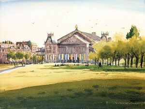 2022Het avondlicht weerkaats op de gulden harp bovenop het Concertgebouw en werpt lange schaduwen over het gras van het Museumplein. Geschilderd op locatie in Amsterdam op een zomeravond.