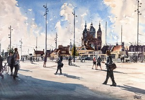 2022Het Stationsplein op een zomerochtend. Een gevoel van dynamiek en beweging uit zich zowel in de wolkenlucht als in de mensen die elk op weg zijn naar hun eigen bestemming. (VERKOCHT)