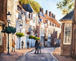 2024Een straatje in Zierikzee op een zomerse dag. De huizen werpen koele schaduwen in de straat met op de achtergrond de typerende stompe kerktoren. (VERKOCHT)
