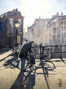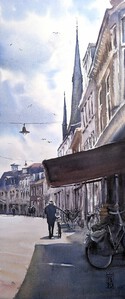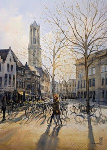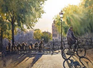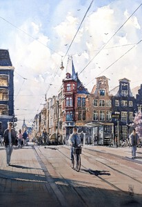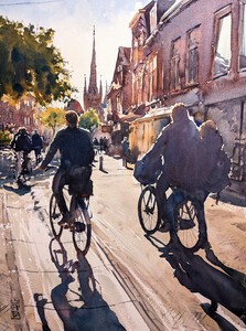 2023Op een warme nazomermiddag fietsen groepen mensen jong en oud door de Rijnstraat richting het centrum van Woerden. Een feest van licht, schaduw en beweging. Op de achtergrond de contouren van de Bonaventurakerk. (VERKOCHT)