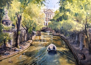 2023Het groen ontluikt volop langs de Oudegracht, en werpt schaduwen over de zonverlichte gracht en werfkelders. Een bootje vaart richting het oude stadhuis. (VERKOCHT)