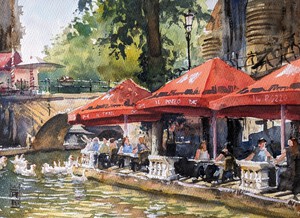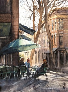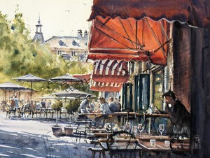 2025De terrassen langs de Oudegracht op een mooie lentemiddag. De kastanjes staan volop in bloei, en complementeren mooi het rood van de parasollen. Geschilderd op locatie. (VERKOCHT)