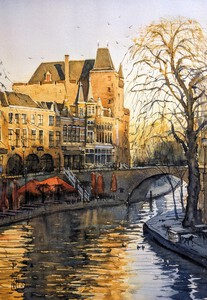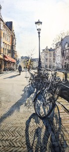 2024Een alledaags tafereel bij de Oudegracht in Utrecht, in het stralende licht van de ochtendzon. (VERKOCHT)