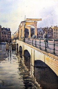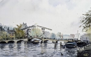 2024Geschilderd op locatie bij de Amstel op een mistige ochtend. De mist creëert een mooi atmosferisch effect met het silhouet van de Magere Brug weerspiegeld in het water.
