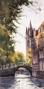 2024Een zomerse middag langs de werfkelders van de Oudegracht. De oude panden bij de Gaardbrug staan half in de schaduw van de bomen. Geschilderd op locatie.
