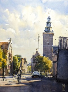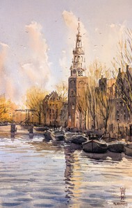 2025De Montelbaantoren in warm namiddaglicht. Geschilderd vanaf een brug in de lente.