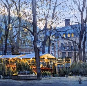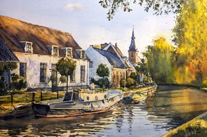 2023Cafés langs de gracht in Lemmer, een gezellig plaatsje in het zuidwesten van Friesland. De vissersnetten herinneren aan het Zuiderzeeverleden en voegen toe aan de sfeer. Geschilderd op locatie.