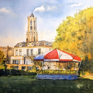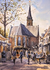 2025De Woerdense markt op het kerkplein, geschilderd op locatie op een mooie zonnige herfstdag. Formaat van de lijst: 50 x 70 cm.