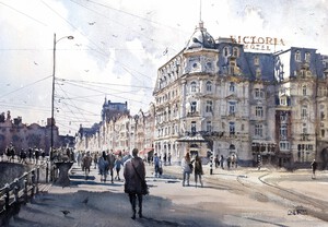 2023Het Victoria hotel bij het Damrak in een dynamisch spel van zonlicht en wolken. (VERKOCHT)