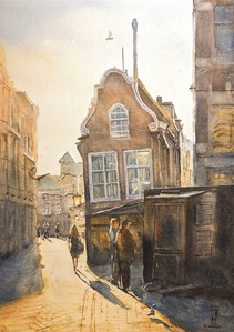2024Het oude centrum van Amersfoort op een mooie en serene winterdag. Een stadsgids staat met een groep wandelaars op de brug bij het monumentale huis Tinnenburg, in het warme licht van de middagzon. Geschilderd op locatie. (VERKOCHT)