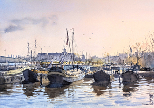 2025De oude schepen in het Oosterdok in het vroege ochtendlicht, geschilderd op locatie, met zicht op het Scheepvaartmuseum.