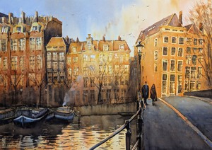 2025Het gouden avondlicht kleurt de panden langs de gracht. De zon weerkaatst in de bovenste ramen terwijl een koppel de brug oversteekt.