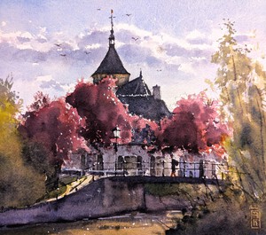 2024Geschilderd op locatie bij de Hofvijver in Den Haag op een zomerse namiddag. Het zonlicht schijnt langs het torentje en strijkt neer op het water.