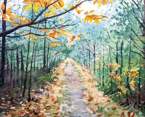2021Een bospad in de herfst. Vurige goudgelen bladeren hangen boven het hoofd, en verderop kleuren de jonge boompjes in een droomachtige blauwe tint.